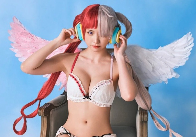 The latest instalment of the franchise sees Luffy meeting the daughter of Shanks, the legendary pirate he's idolized since Shanks saved his life as a kid. Her name is Uta, and her asymetrically-colored design can be seen in this bra set modelled by celebrity cosplayer Enako (left).
